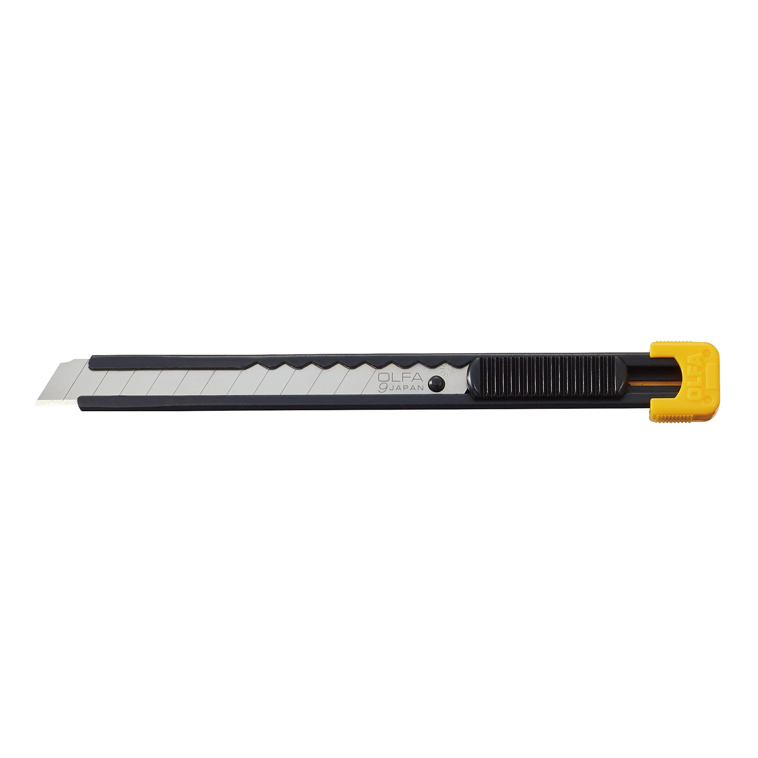 Нож OLFA с выдвижным лезвием, металлический корпус, 9мм небольшого размера и очень удобный для каждодневного использования. Он имеет пластмассовую клипсу для крепления, которая используется для отламывания затупившегося сегмента лезвия, а также металлическую рукоятку. К этому ножу можно подобрать лезвия двух видов: